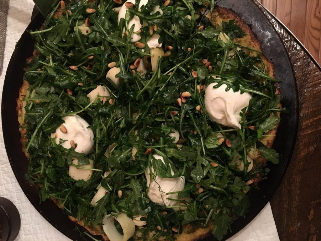 Cauliflower Pizza w/ Arugula, Artichoke, & Burratta Cheese Topping